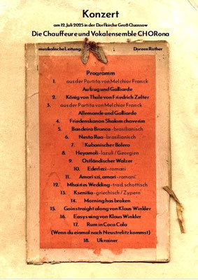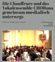 Ein besonderes Ereignis war das gemeinsame Konzert von CHORona mit den Chauffeuren im Ägyptischen Saal von Schloss Hohenzieritz im Juni 2019. Lieder aus Brasilien, Japan, Russland, Finnland und Deutschland trafen auf irische, schottische, englische und orientalische Instrumentalmusik. Ein gemeinsamer Programm-Schwerpunkt waren Klezmermusik und jiddische Lieder, sowie ein schottischer Hochzeitstanz. Für dieses spannende und aufwendige Projekt wurden beide Ensembles mit einem voll gefüllten Saal und begeistertem Applaus belohnt.