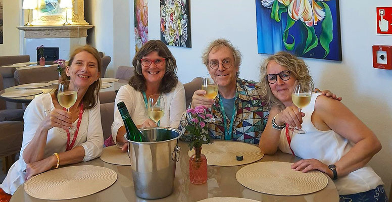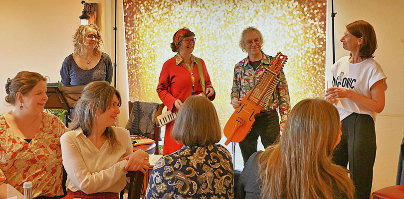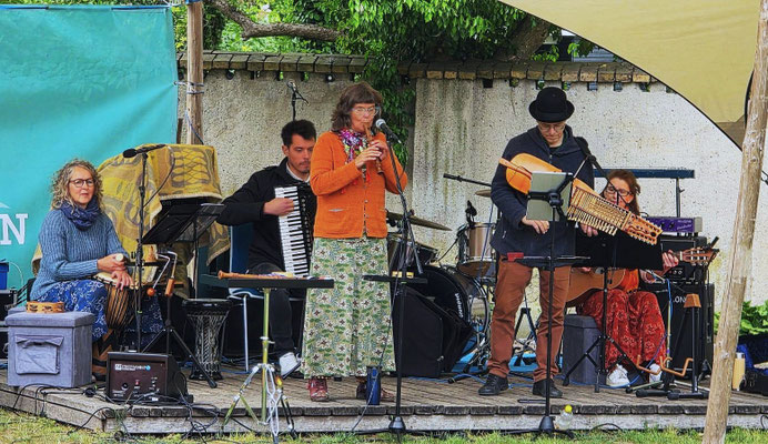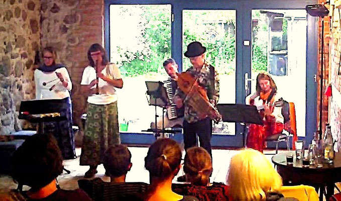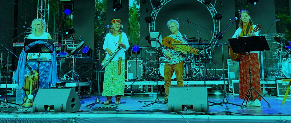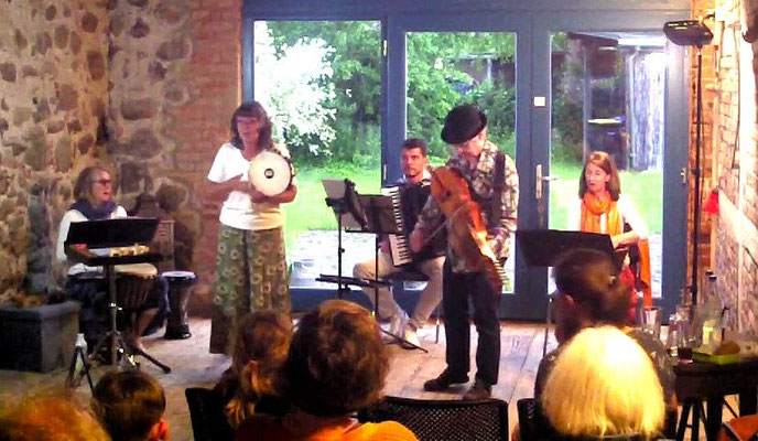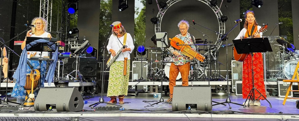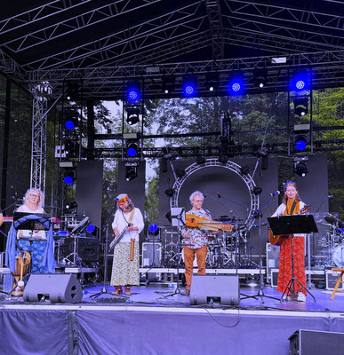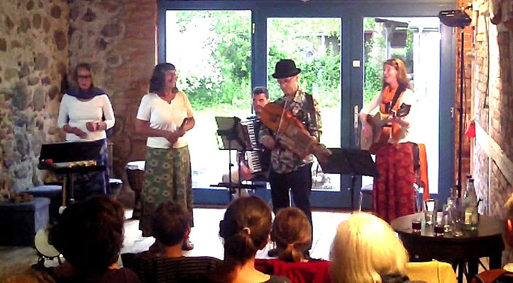 ... und dann geht es mit Mini - Soundcheck - doch irgendwie los, auf der großen Bühne, ohne funktionierende Monitoren, mit griechischer, irischer, jiddischer, türkischer, deutscher Folkmusik und einem extra einstudierten polnischen Lied.
